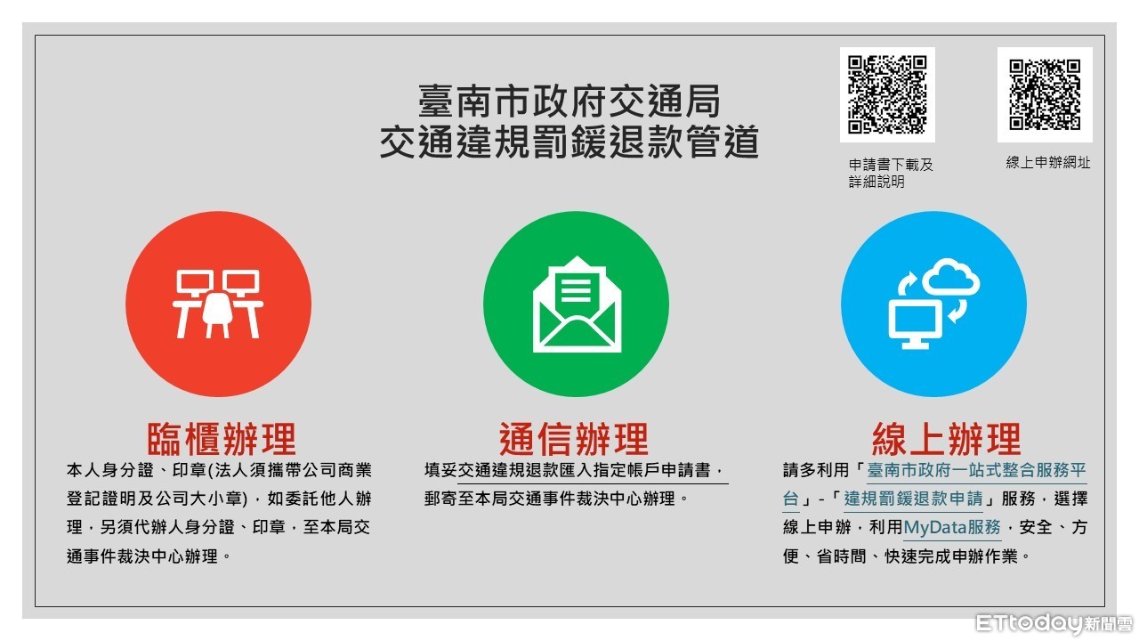 台南市交通局提醒,防疫期間為避免臨櫃群聚,交通違規罰鍰繳納及退款,請民眾多多利用線上服務功能,不過如果是屬於不得郵繳的案件(即須應到案聽候裁決,包括吊扣(銷)駕(牌)照或有代保管物件者),違規人還是需要到裁決中心各辦公室服務窗口臨櫃辦理。