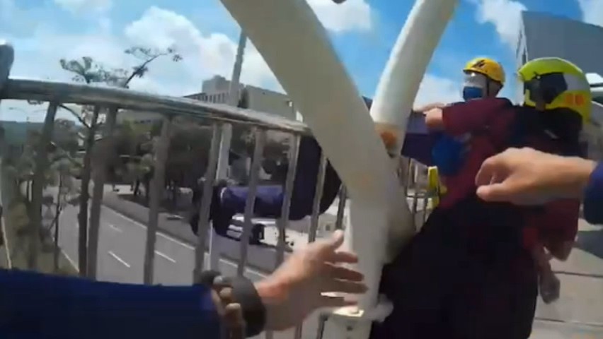 清水警分局光華所員警紀宇哲、楊鎮宇,日前上午10點40分獲報沙鹿區台灣大道七段天橋上,有名男子跨坐在天橋可能想要輕生,警方緊急趕到現場,發現周男情緒相當激動,準備往下跳,警消一面安撫情緒,一方面趁其不注意,瞬間拉住男子並拉進天橋,成功挽救性命,周男幸無受傷。