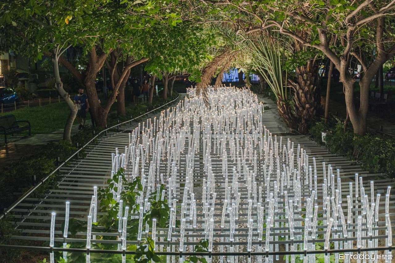 ▲日本藝術家島田正道創作的「You Can't Catch Me豆娘」,在圳邊裝設24座模擬豆娘姿態的燈具,觀展時會先發現棲息於柵欄上的發光豆娘,若接近這些燈具就會依序亮起,營造豆娘飛離的動畫效果。