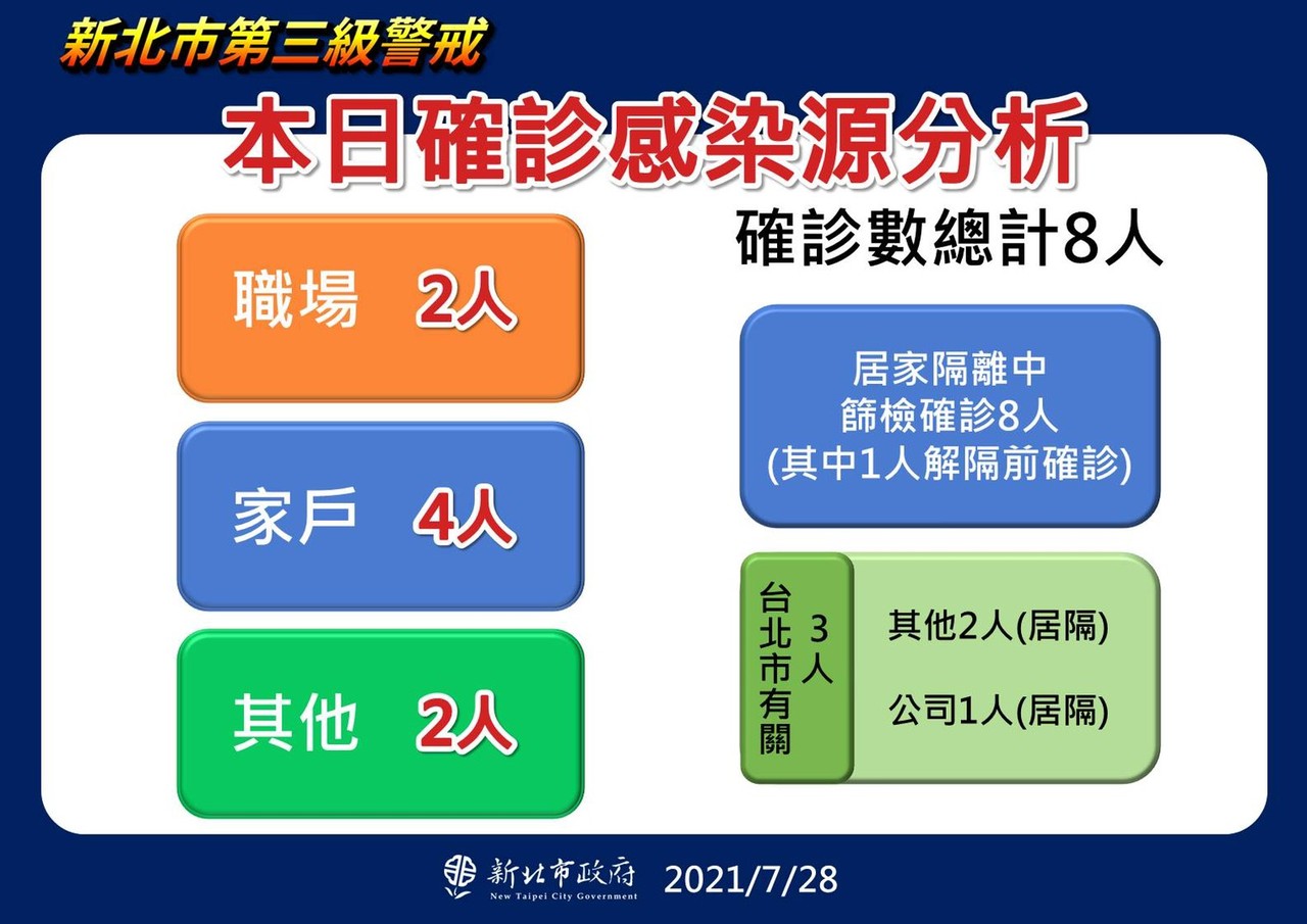 中央流行疫情指揮中心28日公布國內新增20例新冠肺炎病例,分別為18例本土及2例境外移入,個案分布以新北市8例最多,其次為台北市6例、桃園市3例、高雄市1例。針對新北8例個案,新北市政府28日在防疫記者會說明感染源,8例全部都是居隔的個案,2位職場的感染,4位是家戶感染,2位是被朋友感染。