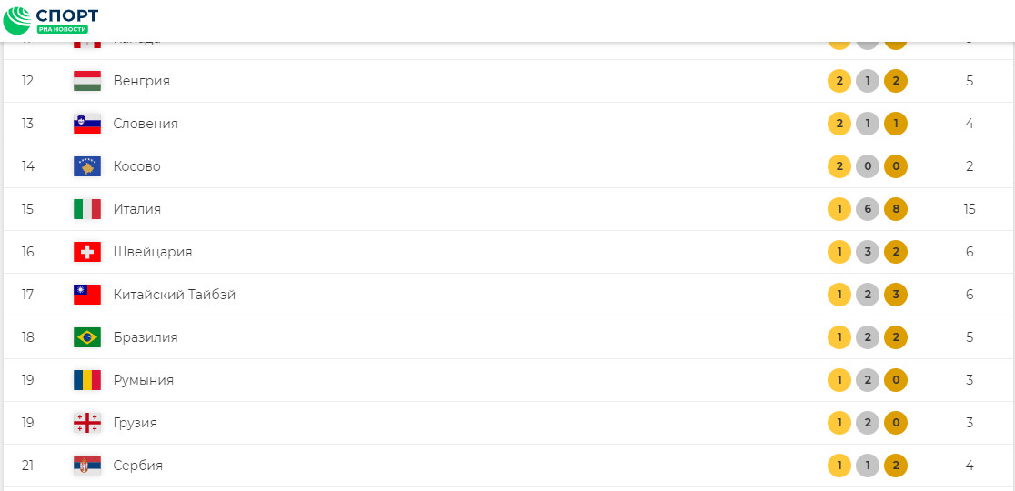 俄羅斯官媒《俄新社》(РИА Новости、RIA Novosti)在獎牌榜上,將暫居第17名的台灣,標註青天白日滿地紅旗,只不過名稱的部分,還是使用「中華台北」( Китайский Тайбэй )。