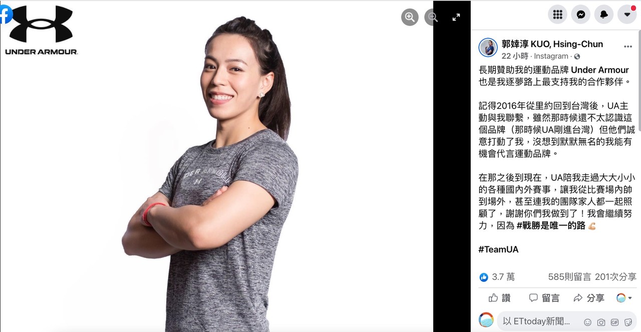 郭婞淳28日特別發文感謝Under Armour,「記得2016年從里約回到台灣後,UA主動與我聯繫,雖然那時候還不太認識這個品牌(那時候UA剛進台灣)但他們誠意打動了我,沒想到默默無名的我能有機會代言運動品牌。在那之後到現在,UA陪我走過大大小小的各種國內外賽事,讓我從比賽場內帥到場外,甚至連我的團隊家人都一起照顧了,謝謝你們我做到了!」