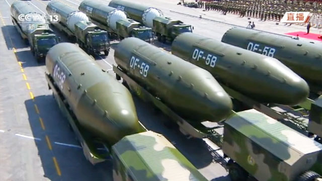 ▲中國大陸的東風5B分導式多彈洲際戰略核導彈在閱兵式中亮相。