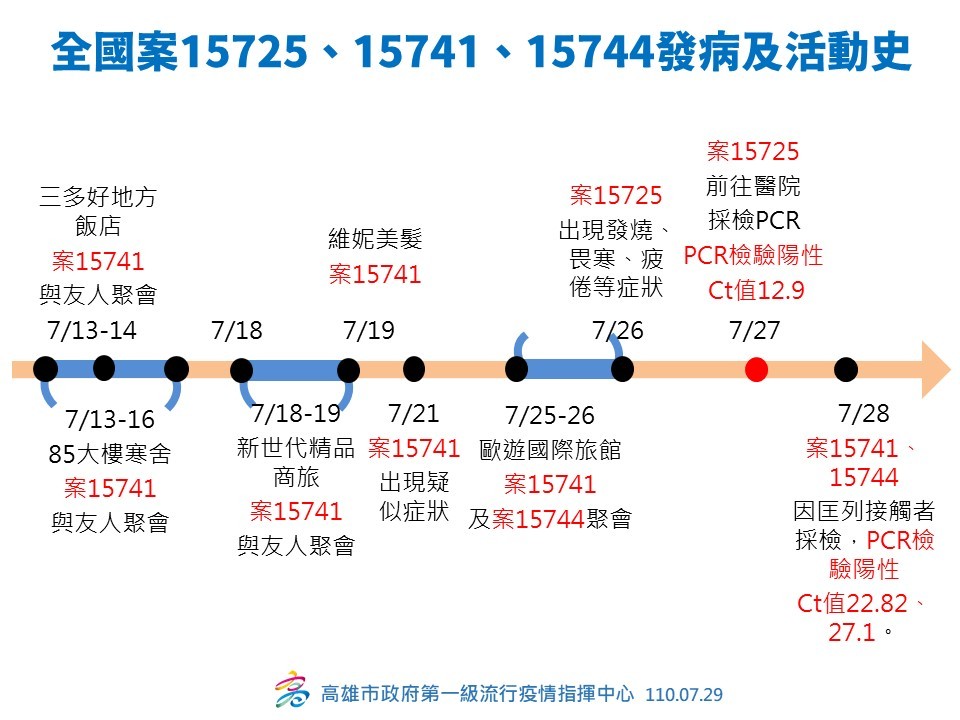 疫調指出,案15741自7月13日起多次外出與北部友人聚會,直到21日疑似出現症狀後,仍在25、26日到「歐遊國際旅館」與案15744聚會,13天內去了至少4家商旅、飯店。