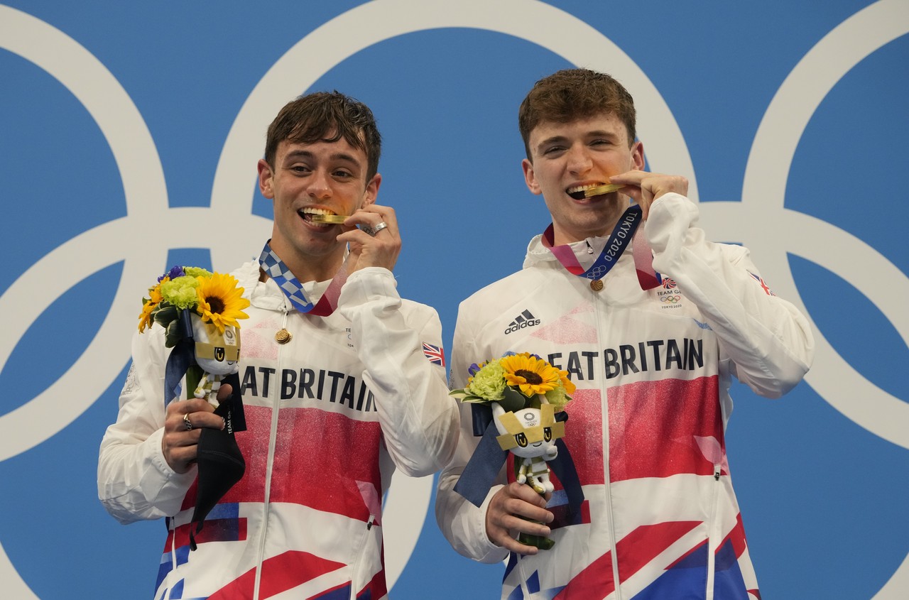 ▲英國跳水王子戴利(左)和馬提李(右)組合26日奪得2020東奧男子雙人10米跳板奪金,2人接受頒獎時都咬了獎牌。(圖/達志影像/美聯社)