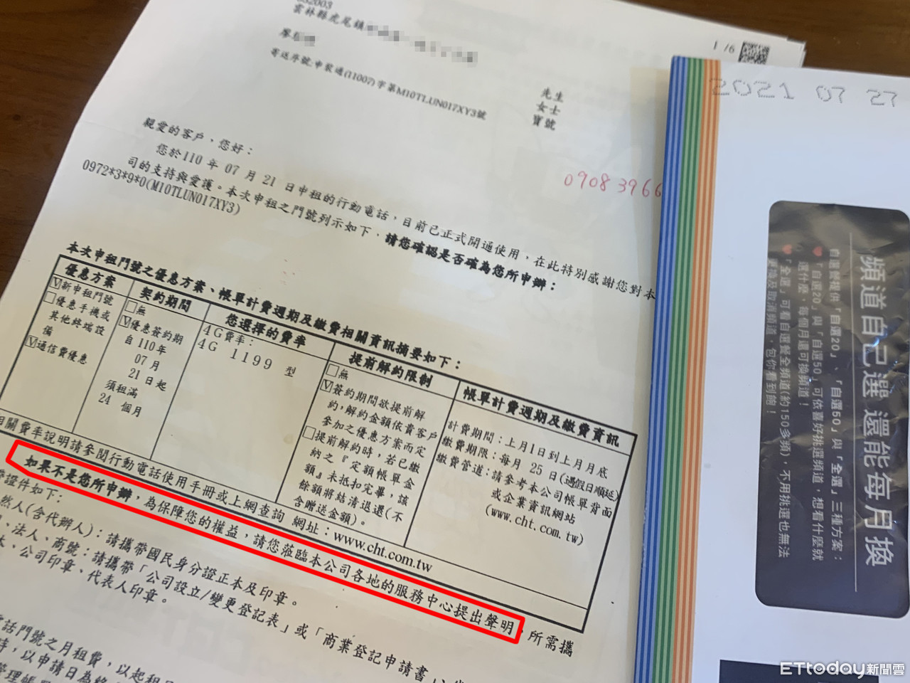 ▲雲林一名廖先生遭人冒名以線上申請方式簽約新門號,在電信公司8天後寄達「門號已開通」通知書,才知道已被冒名申辦,且已於該門號中產生多筆消費金。(圖/記者蔡佩旻攝)