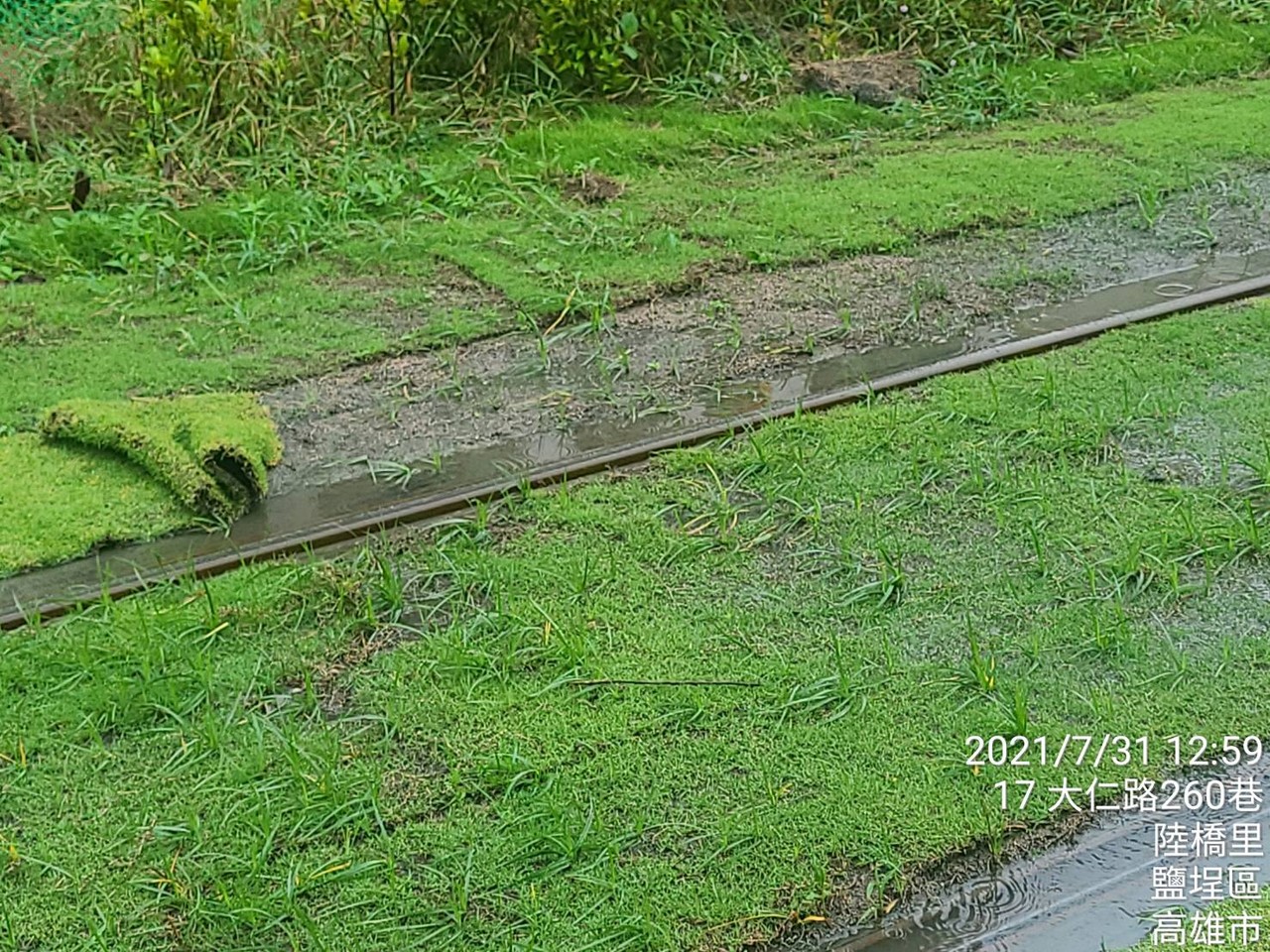 ▲高雄輕軌軌道旁新植草皮因大雨積水被掀起。(圖/高雄捷運公司提供)