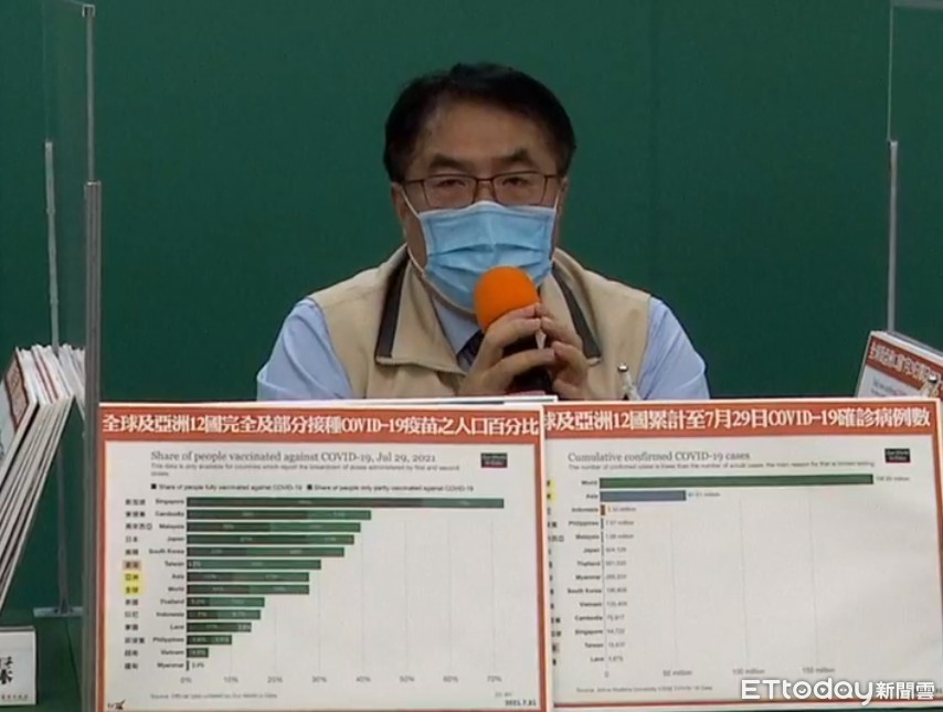 另外,對於疫苗的接種,黃偉哲說,全球包括亞洲區,還有全球的平均,還有亞洲12國,每百人口接種的疫苗劑次的比較,最多的當然是新加坡,第二多的是柬埔寨,第三多的是日本,第四多的是馬來西亞,第五多的韓國,第六多的是台灣,你可以看的到台灣在5月19日到7月27日,2多個月的時間,台灣覆蓋率快速地衝上來,事實上對於疫苗,政府還有民間大家相關的努力,包括國際的協力也幫了很大的忙,讓我們疫苗的覆蓋現在變成亞洲第六。