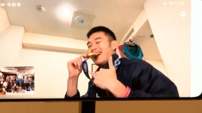 羽球男雙組合「麟洋配」王齊麟、李洋以直落二擊敗中國隊奪金,拿下台灣奧運史上首面羽球金牌,王齊麟透過視訊接受訪問,提到很想念媽媽煮的菜,前進日本東京比賽前兩個月都回不了家,懷念家的味道,此外,兩人勝出後深情對望又擁抱,讓許多人大喊「在一起」,他則笑說,如果感覺對了可能真的會親下去。