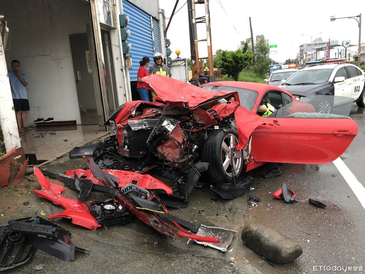 恆春警方初步調查,今日下午近5時,在台26線通往墾丁途中,28歲朱姓遊客駕駛保時捷跑車,載著21歲的溫姓妻子,途經恆南路段時,疑似因天雨路滑操作不慎,車輛打滑先行撞擊恆南路2處民宅柱子後,再行撞擊停放於路旁小客車(無人在內),車頭嚴重毀損,被撞的自小客車翻覆。