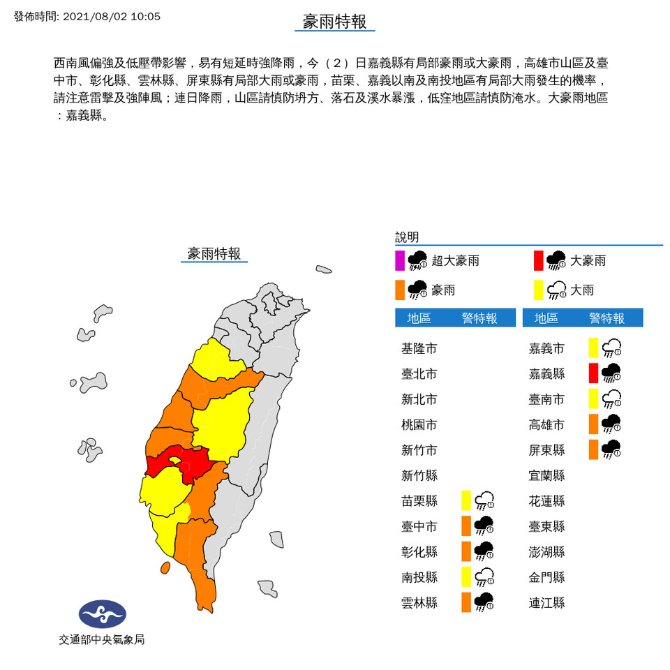 受到西南氣流影響與低壓帶影響,近日為中南部地區帶來豪、大雨。於昨日(8/1)晚間起,西南風強風軸逐漸北移至巴士海峽,但整體環境仍持續受西南風和低壓帶影響,對此,氣象局於今日(8/2)上午持續針對新竹以南10縣市發布豪雨特報,並10時5分,將嘉義縣升格為大豪雨警戒地區,10時35分再將雲林縣列入大豪雨警示。