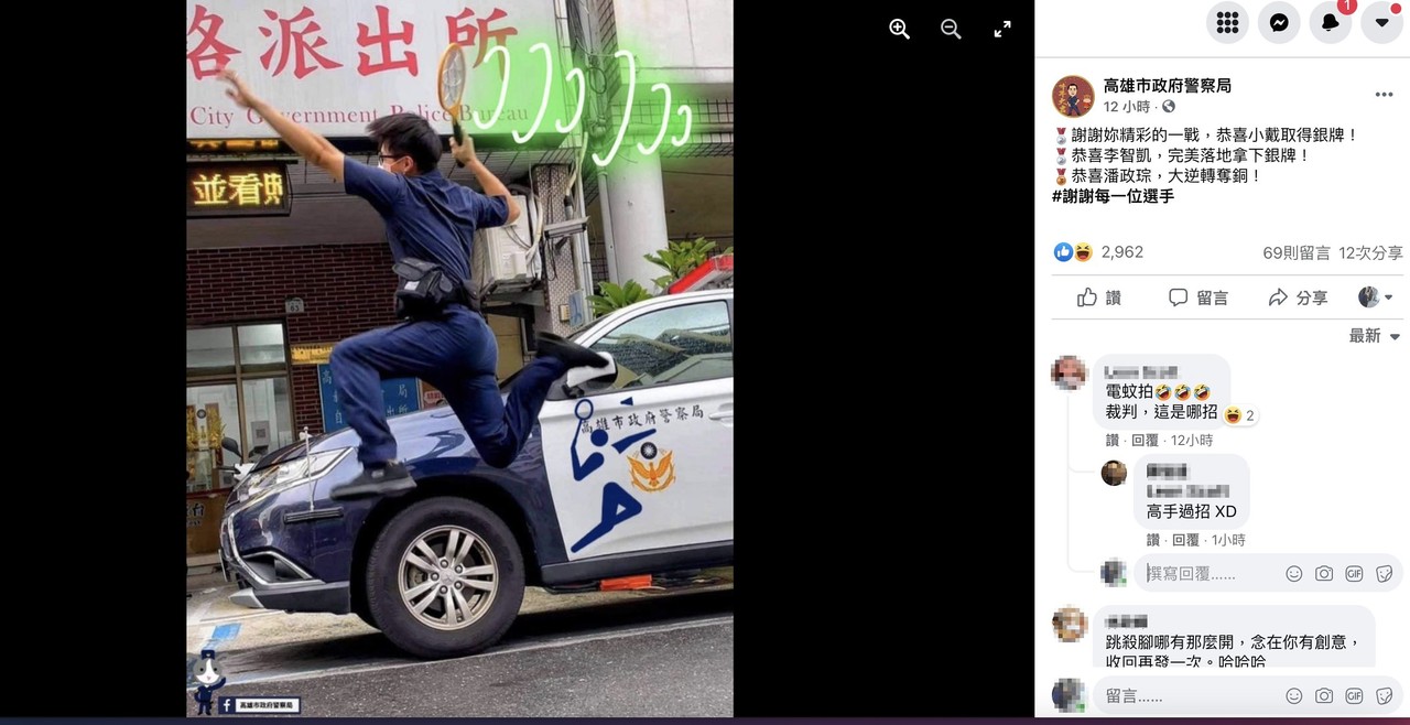 ▲高雄市警察局臉書一張kuso羽球照,引網友討論!尤其是電蚊拍 。(圖/翻攝臉書)