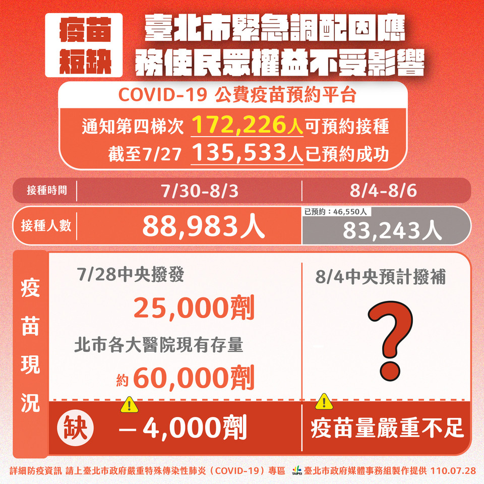 近期包括台北市、新北市在內,各地方縣市政府紛紛喊出疫苗不夠問題。台北市政府日前提及,北市將第4輪疫苗接種分為兩階段,第一階段為7月30日至8月3日,先前緊急調用疫苗,加上中央配發的2.5萬劑之後,才勉強達到6萬劑替第一階段民眾接種;眼看第二階段8月4日至8月6日即將開始施打,台北市副市長蔡炳坤2日表示,將於3日向中央開會提出,確認中央配發的疫苗數量是否足夠。