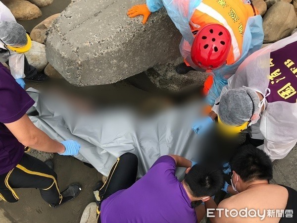 ▲上身赤裸男屍卡在海邊消波塊。(圖/桃園市政府消防局提供)