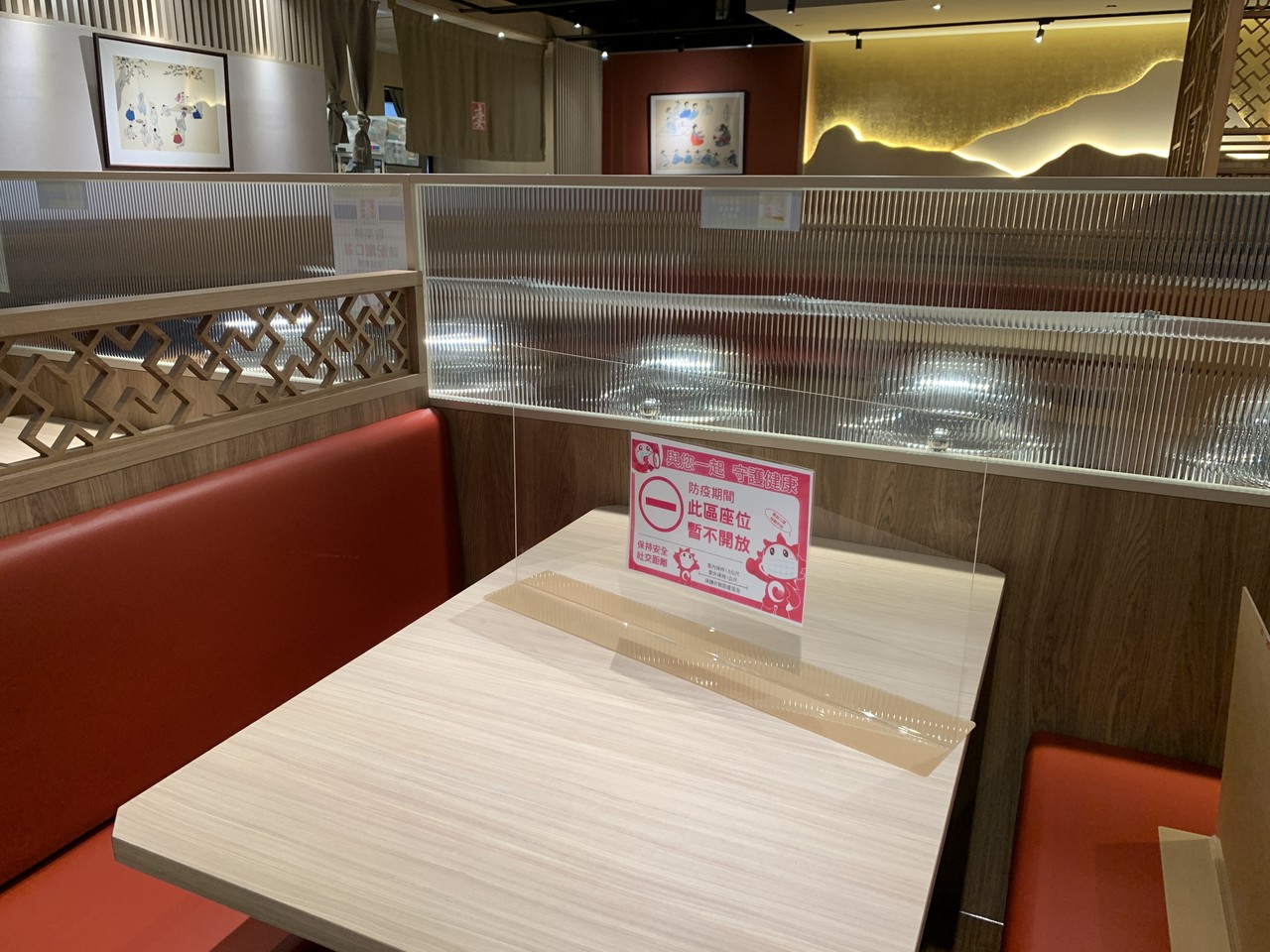 開放餐飲內用,不同桌保持1.5米距離,攤台區(吧台席)禁食,所有桌椅裝置隔板並採梅花座。台北店公食區原900席座位減至300席,小碧潭店公食區原480席減至125席,皆僅留三分之一座位。