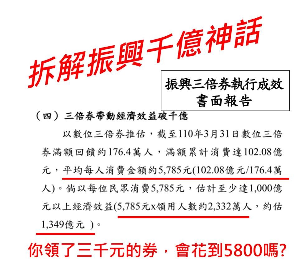 蔡壁如指出,經濟部上個月的評估報告,使用數位券的民眾,消費3千元滿額後,會拿到2千元回饋金,平均消費5,785元,來推論領振興券的人都會花這麼多錢,而總共產生1,349億元效益。實際上,領取數位振興券的只占全部的7.56%,人數只有176萬人,用來推論其他92%使用紙本振興券的人,根本膨風、吹牛。