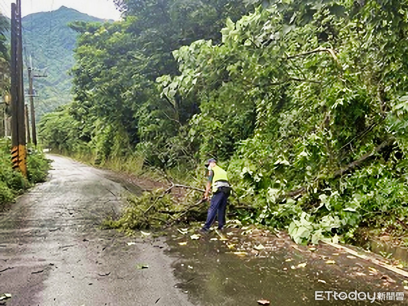 連日西南氣流為屏東帶來大雨,造成三地門鄉口社村聯外道路有路樹折斷倒塌影響交通,轄區的里港警分局口社派出所員警巡邏發現,立即下車排除,由於該路段有土石流現象,並設置交通錐,利用村內擴播系統,提醒往來用路人注意,避免發生危險。