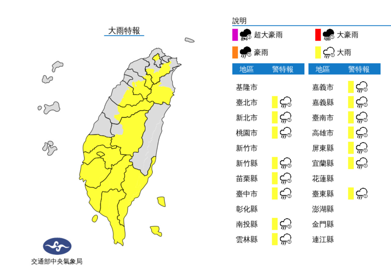 ▲氣象局發布大雨特報。(圖/氣象局)
