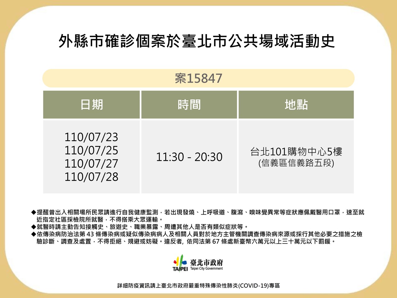 北市衛生局提及,另一個新北個案為案15847,初判可能感染源尚待釐清,個案曾於7月23日、7月25日、7月27日和7月28日上午11時30分至晚間8時30分於台北101購物中心5樓上班,台北101購物中心已於8月3日晚間6時完成清消,8月4日停業一天。