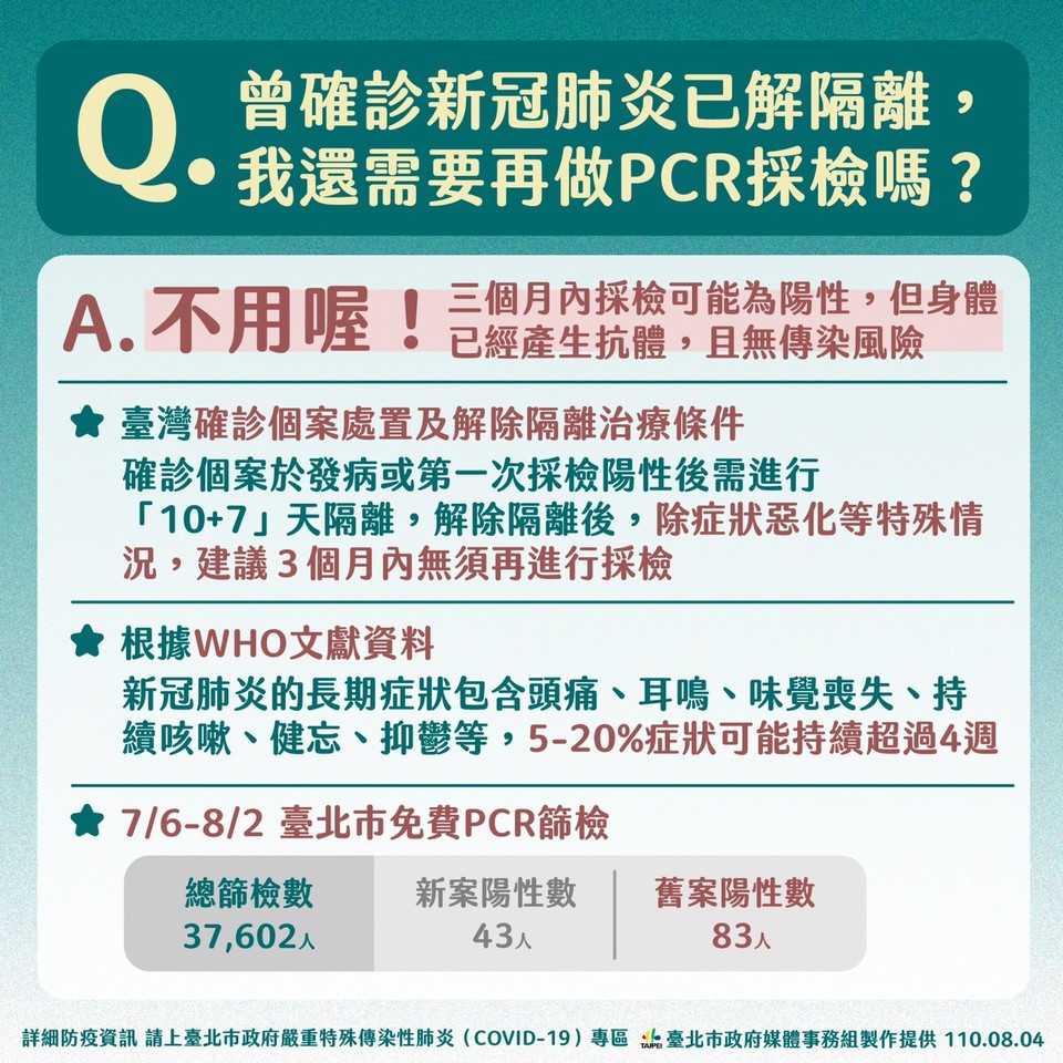 中央流行疫情指揮中心4日公布,新增20例本土確診,以新北市14例最多,其次為台北市5例,另確診個案中無新增死亡。台北市政府下午3時15分召開防疫記者會,台北市長柯文哲表示,北市7家醫院免費PCR篩了3.7萬人左右,抓到83例「舊陽性」,呼籲這些人康復後Ct值若大於30,就不用再回去做PCR。