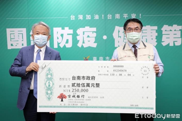 ▲京城銀行捐25萬助快篩,力挺藝文團體健康回歸舞台,台南市長黃偉哲表示感謝。(圖/記者林悅翻攝)