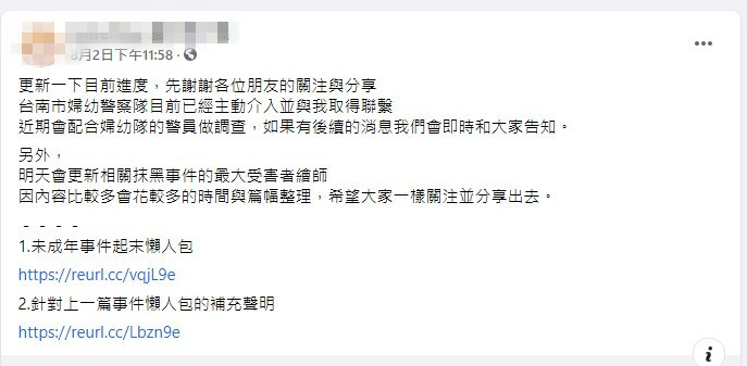 該名受害女網友也8月2日在臉書PO文更新:「台南市婦幼警察隊目前已經主動介入並與我取得聯繫,近期會配合婦幼隊的警員做調查,如果有後續的消息我們會即時和大家告知」。「另外,明天會更新相關抹黑事件的最大受害者繪師,因內容比較多會花較多的時間與篇幅整理,希望大家一樣關注並分享出去」。