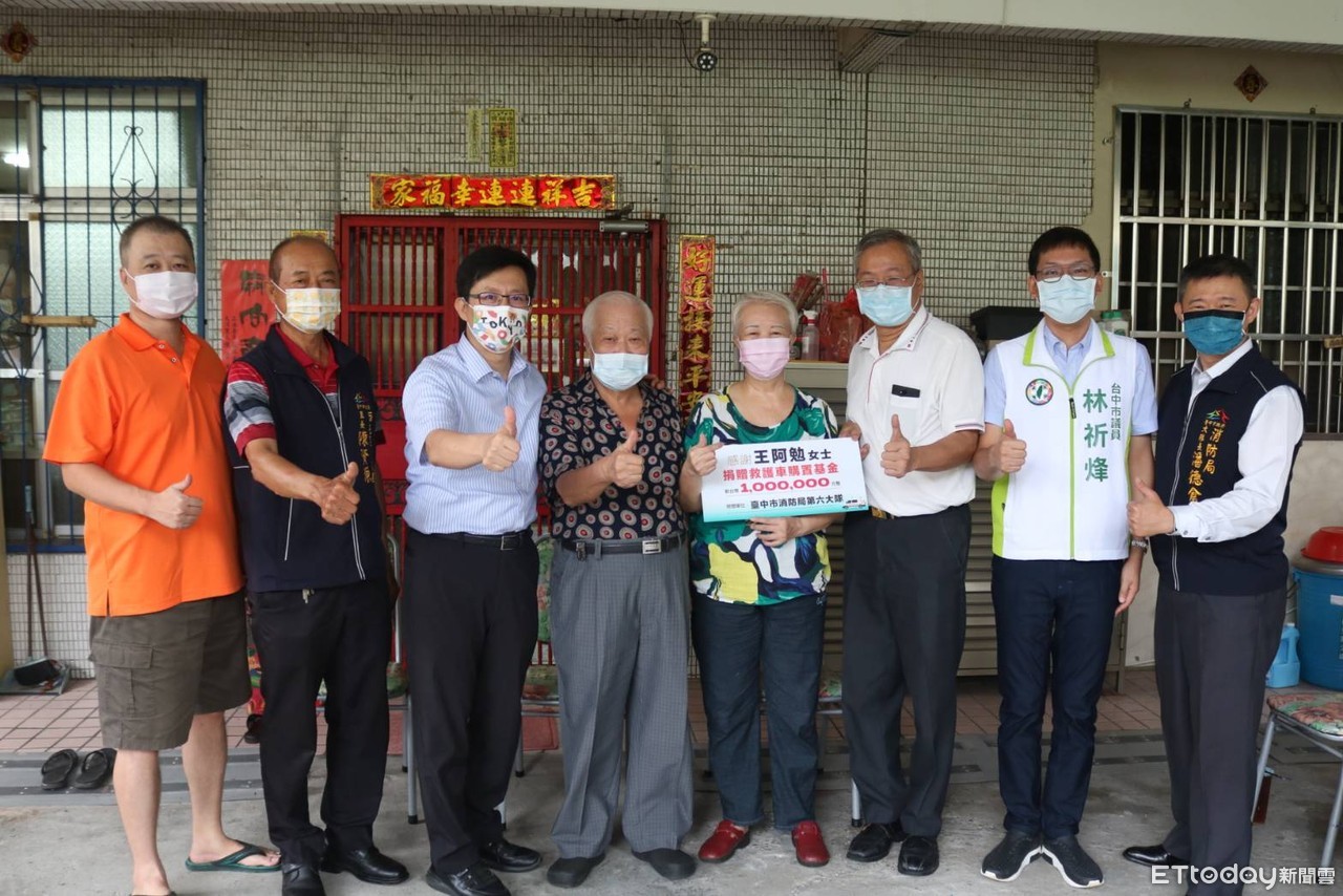 王阿勉阿嬤5日透過立法委員張廖萬堅、市議員林祈烽的牽線,以及大河里長陳資源的陪同下,今日捐出一百萬救護車購置基金,給台中市消防局第六救災救護大隊。