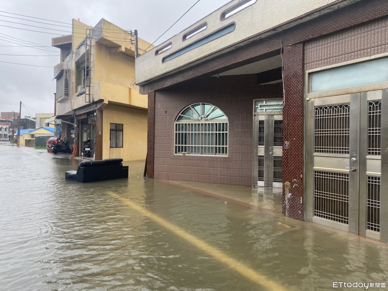 ▲口湖鄉下崙馬路成漂漂河,泡水移出門口的沙發順水流漂到路上。(圖/記者蔡佩旻翻攝)