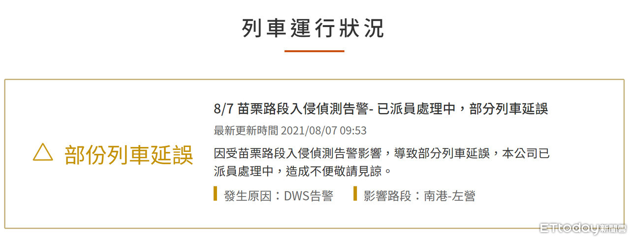 高鐵苗栗路段因疑似土石入侵,經偵測告警影響,導致部分列車延誤,目前高鐵已經派員處理當中。據悉,苗栗路段因受大雨造成邊坡落石影響,導致入侵偵測告警作動,為確保旅客安全,目前全線以單線雙向模式運轉,所有列車均限速通過。