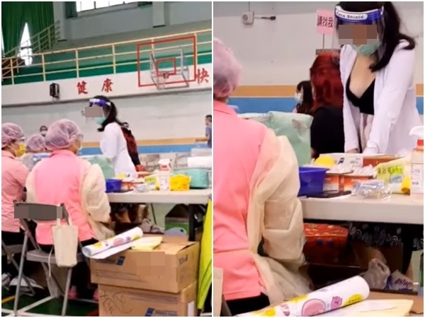 影片顯示,該接種站的地點疑似學校的活動中心,有3名穿著完整防護頭套、手套的人員在桌子邊處理事情,旁邊則有一名帶著透明防護頭套的長髮女子,身穿黑色低胸上衣配上白色薄紗外套,站在桌子的另一側疑似在幫忙遞交文件。