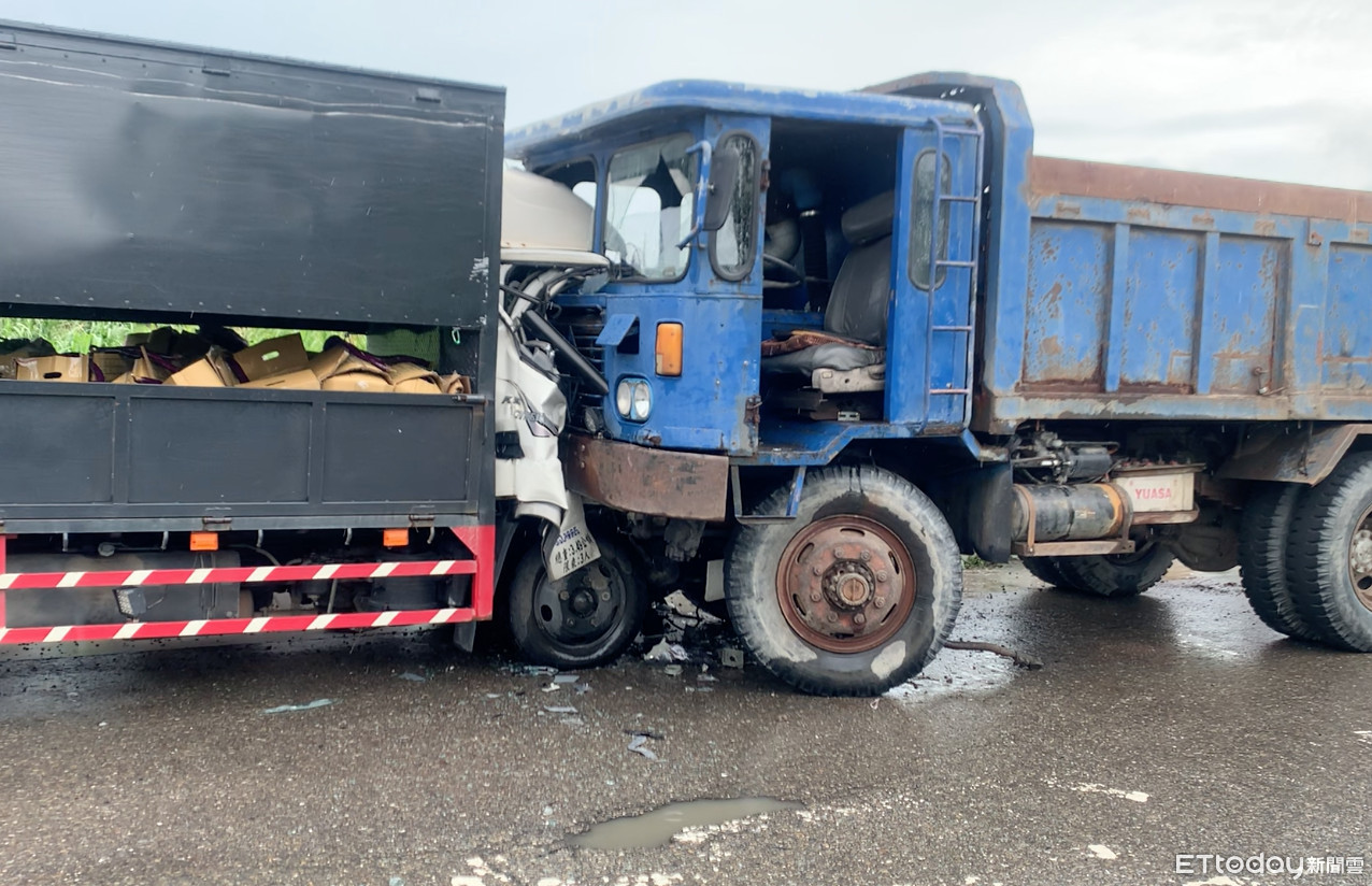 ▲ 大貨車正面衝撞拼裝車,造成兩車頭嚴重毀損。 (圖/記者蔡佩旻攝)