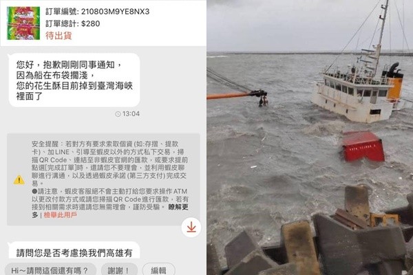 一名女網友日前在網路上購買花生酥,但賣家稍早前緊急私訊她,表示船在布袋擱淺,她訂的花生酥掉到台灣海峽裡面了,超荒唐的理由讓原PO傻眼,擔心被騙,找友人幫忙了解一下狀況,發現真有此事,原PO也強調,新聞都有報,絕對不會是詐騙。貼文一出,許多網友都笑翻。