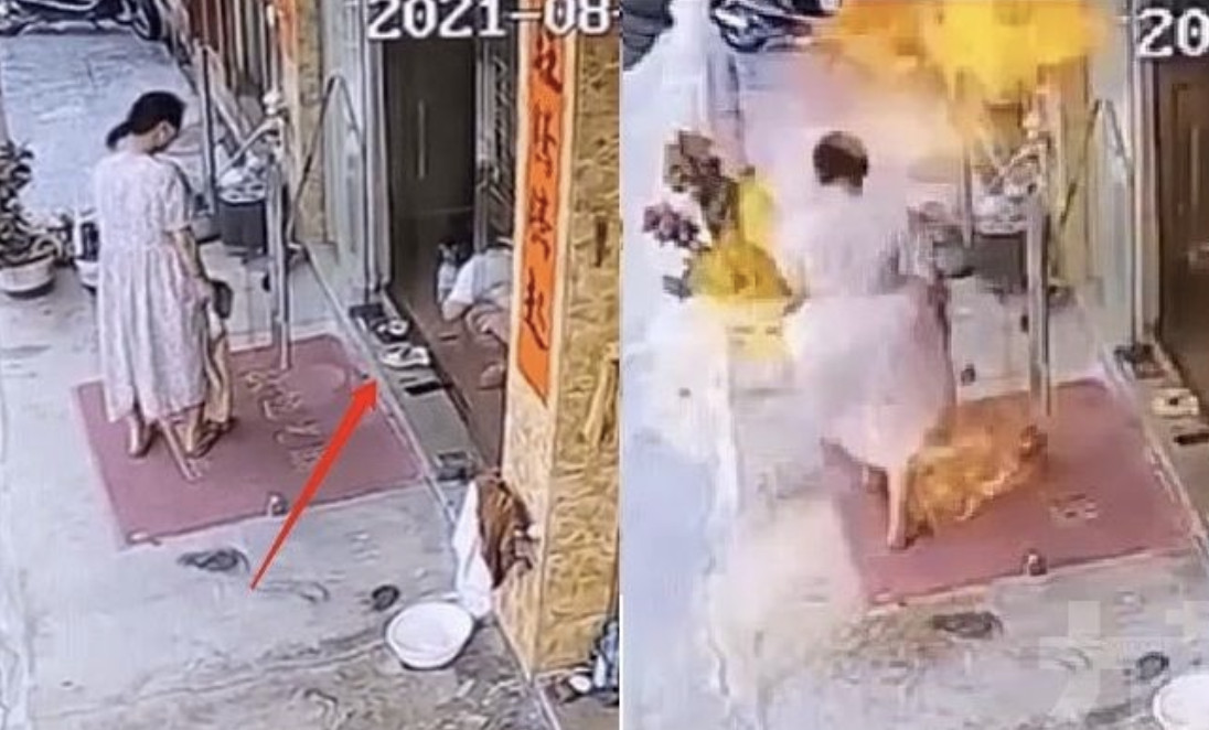 一段攝影機畫面顯示,8月6日在廣東揭陽,一女店員在店鋪門口操作,突然火苗瞬間竄起,把正在一旁圍觀的年輕母子全身瞬間點燃。