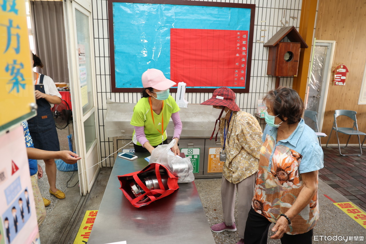 ▲長青食堂長者自帶空便當餐盒,等工作人員打菜帶回家,沒進到食堂內。 (圖/記者蔡佩旻翻攝)