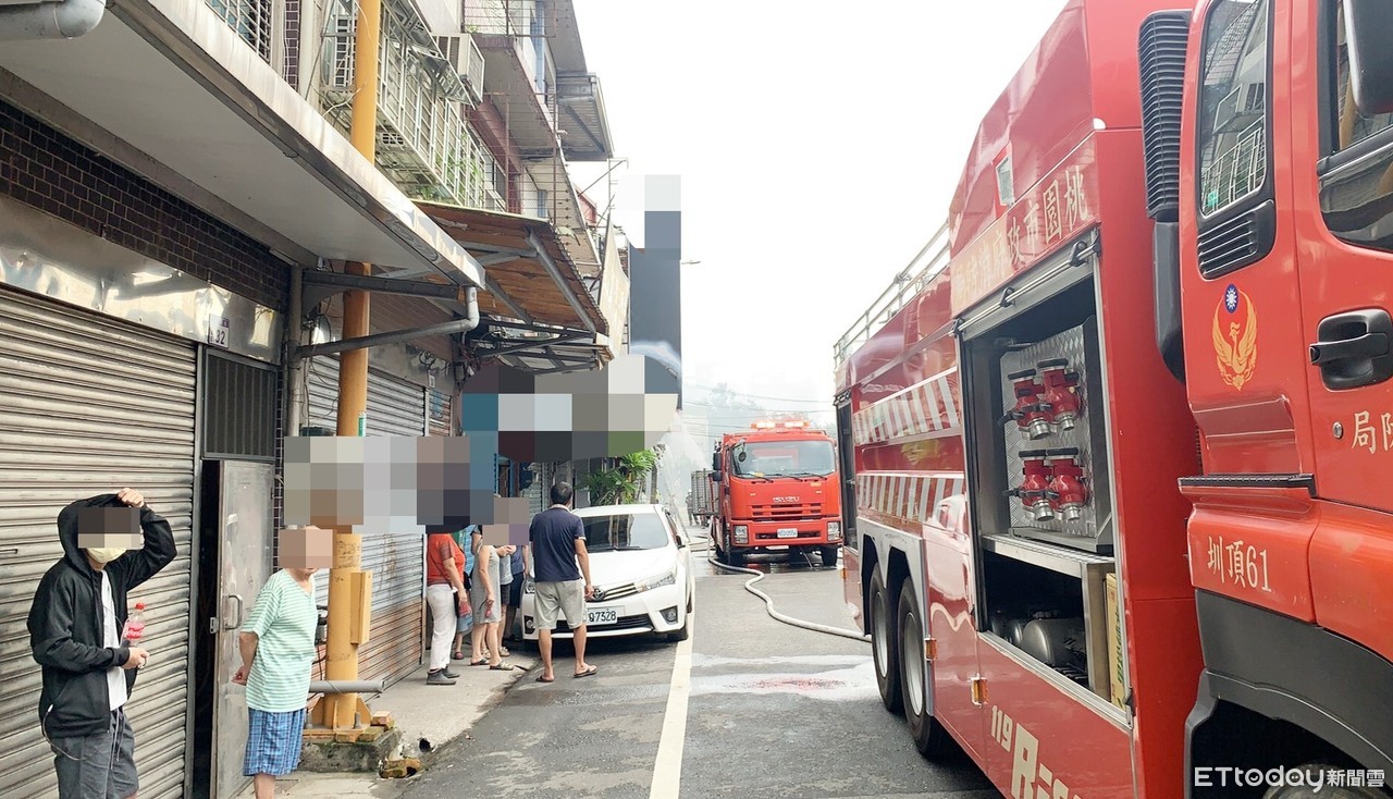 ▲桃園市大溪區石園路1家早餐店10日下午發生火警,消防人員灌救中,引發居民圍觀。(圖/記者沈繼昌翻攝)