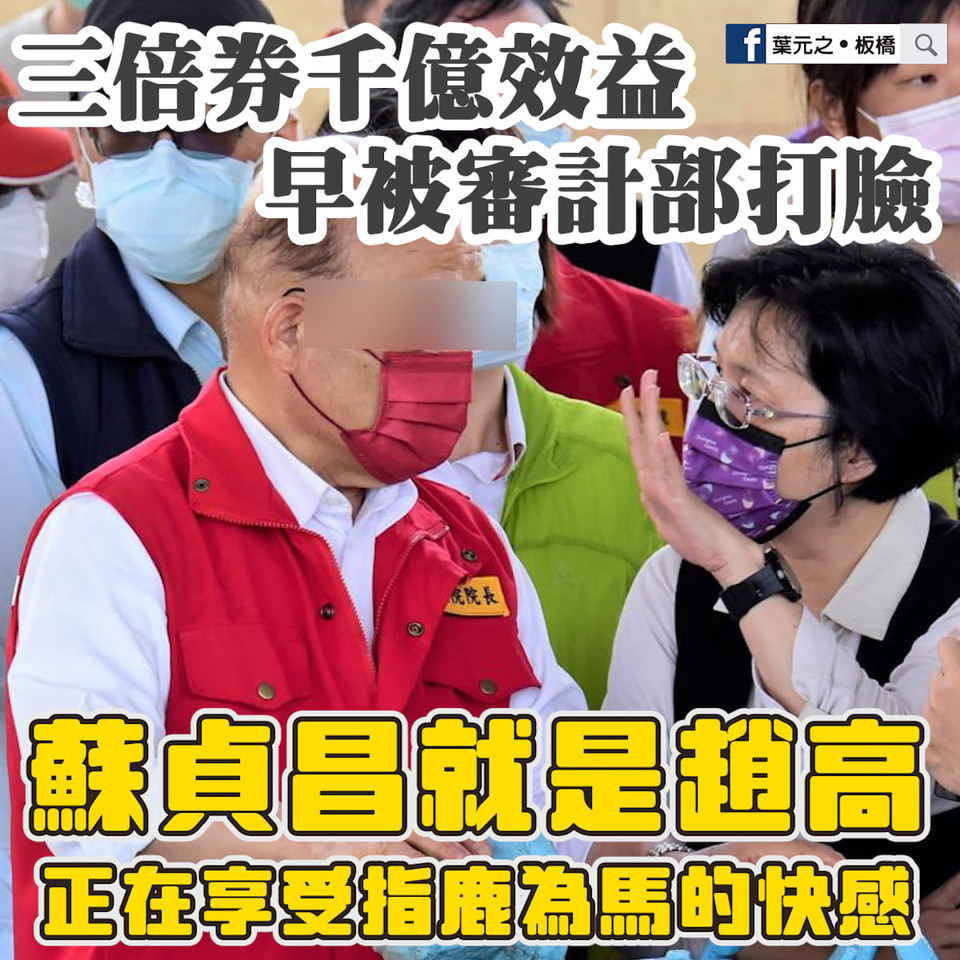 葉元之認為,蘇貞昌宣傳3倍券的說法漏洞百出,行為與趙高顛倒是非「指鹿為馬」無異,他表示,蘇貞昌面對5倍券爭議時,廢話連篇、跳針重複去年3倍券大成功創造經濟效益,但審計部早就已經打臉,指出3倍券創造千億經濟效應的說法,沒有資料可以佐證。