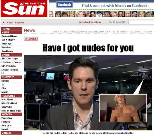 據英國《太陽報》報導,名嘴何吉斯(Dan Hodges)接受政論節目主持人的連線訪問,討論工黨政策的立場,只是後方卻有個金髮美女攪局──她正神情陶醉的激情著,而且還全裸露點。報導形容,這畫面其實還算「幸運」,因為這是在晚間9點之後才播出。