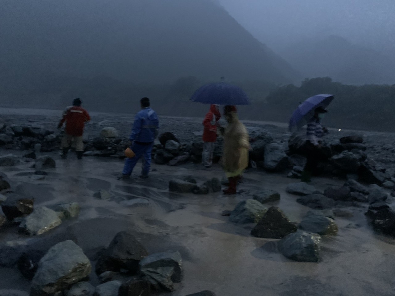 江維明表示,他被推離3-4公尺遠,等他起身的時候才發現手已經空了,身旁都是大木頭、大石頭。目前謝宜真代表仍下落不明,天黑也造成尋找的困難,且現場土石仍有崩落現象,警消已撤離,預計明早6點再持續搜救。