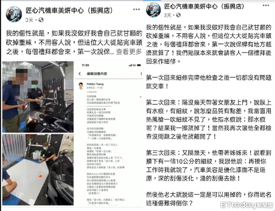 曾給5寶爸工作的暖心汽車美容業者陳俊霖近日在臉書上貼文,提到日前一名福特Focus車主將愛車送到店內貼膜,未料完工對方付款取車後,先後帶女友、姊姊連續上門5次,抱怨車膜有水痕、有細紋、不完美,陳俊霖決定免費重貼車膜,甚至還讓Focus車主拿LED探照燈驗車,但車主仍不滿意,不僅要求退費、日日在網路給差評,讓他無奈感嘆服務業難為,「遇到史詩級奧客!」