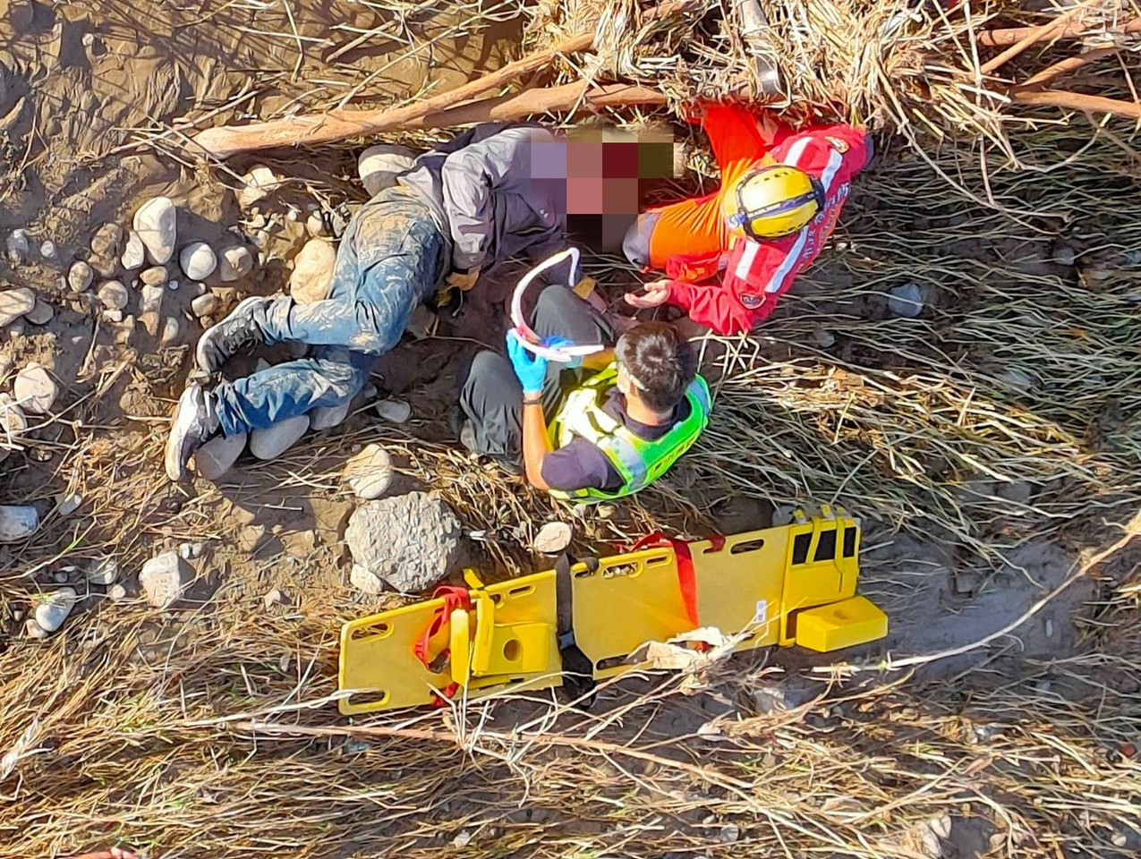 消防局清晨6點09分獲報,派遣東山分隊消防車2輛、救護車1輛、人員8名,17分即趕抵現場,發現陳男倒在橋下土石堆,頻頻喊痛,消防員利用長背板從堤防救起,檢傷發現手腳疼痛、意識清醒,送慈濟醫院,沒有生命危險。