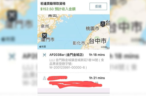 文章曝光後,網友們紛紛笑歪樓,「只給你1h18mins取餐,真的不行,應該要給多一點時間?」「越來越扯,跨縣就很扯了,還跨島」、「笑死1個小時來回?當你噴射機啊」、「酷耶~還可以跨海訂餐」、「這樣才150塊?」「運費只有152,是搭廉價航空嗎」、「會不會下次會接到廣東的,還要辦台胞證」、「智X派單:一樣在配送範圍內喔」、「您的外送員正在跨越海峽」。