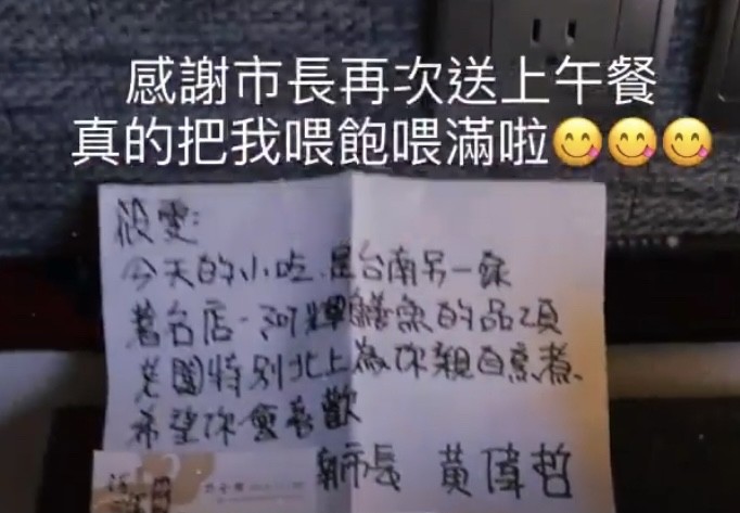 黃偉哲市長於8月10日委託度小月台北忠孝店代為烹飪寄送到防疫旅館給檢疫隔離的黃筱雯「台南小吃」美食,有擔仔麵、肉燥飯、安平蝦捲、虱目魚丸等之後,讓黃筱雯開心在IG打卡感謝。13日黃筱雯在IG打卡透露,午餐又收到台南美食了,特別留言:「感謝市長再送上午餐,真的把我喂飽喂滿啦」!