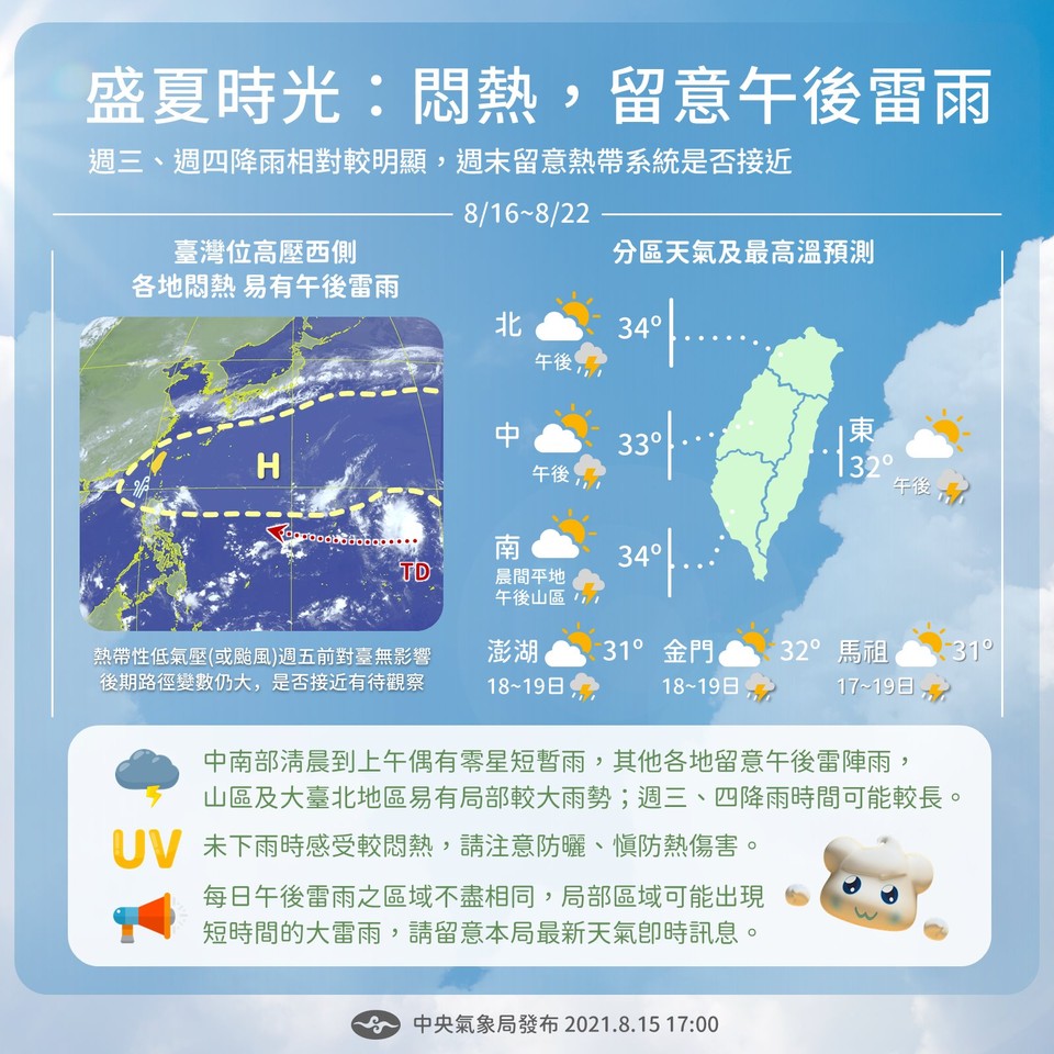 根據中央氣象局今(8/15)17時最新預報,隨太平洋高壓籠罩,未來一週各地多雲到晴,但午後還是有局部短暫雷陣雨突襲,尤其各地山區和大台北地區有局部較大雨勢發生機率;週一到週四間,清晨至上午中南部沿海地區也有零星短暫陣雨或雷雨。