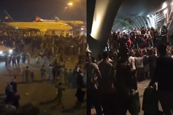 阿富汗商人巴拉克(Shoaib Barak)15日晚間約7時登機後聽見槍響,在機上等到過了午夜卻被趕下機,並拍下停機坪擠滿數百人的畫面,可見大批民眾不斷奔向飛機。他說明,這架飛機最多可容納360名乘客,卻有600多人登機,80%乘客沒有護照和簽證,機場人員未進行任何安檢或檢查護照,他也看見部分乘客攜帶軍用無線電與槍枝。