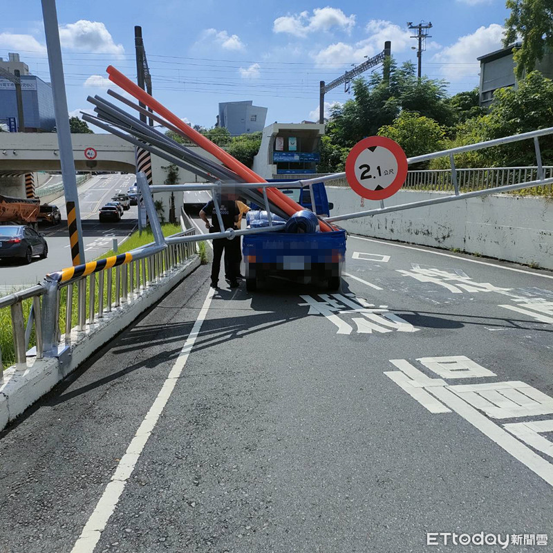 據了解,16日上午9時多,1輛載著長水管物料的貨車,從小東路西向東行,經過小東地下道時,因誤闖機慢車道,車上的長水管物品撞上標註限高2.1公尺的金屬限高架,整座限高架損壞、砸落路面,當時無其他人車經過,幸未造成人員傷亡。