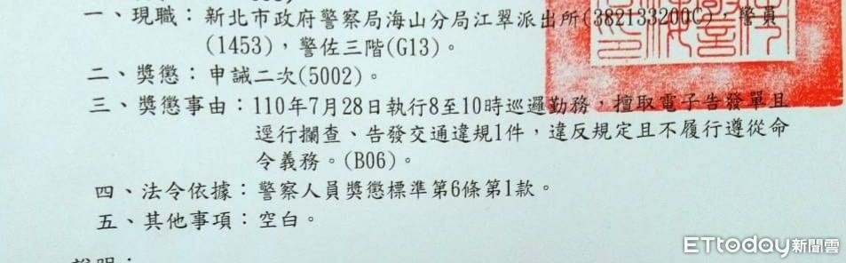 ▲女警行政違失被記申誡二次 。(圖/記者陳以昇翻攝)
