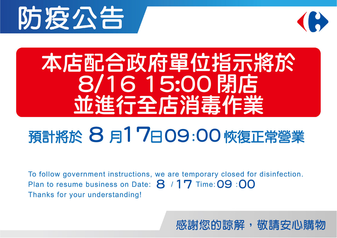 家樂福花蓮店16日上午接獲花蓮衛生局通知,有確診者於4日曾到店內短暫停留消費,賣場接獲通知後,隨即通知消毒單位準備清消,將於下午3點閉店消毒,預計將進行兩次的店內外大清消作業,預計於明日恢復營業。
