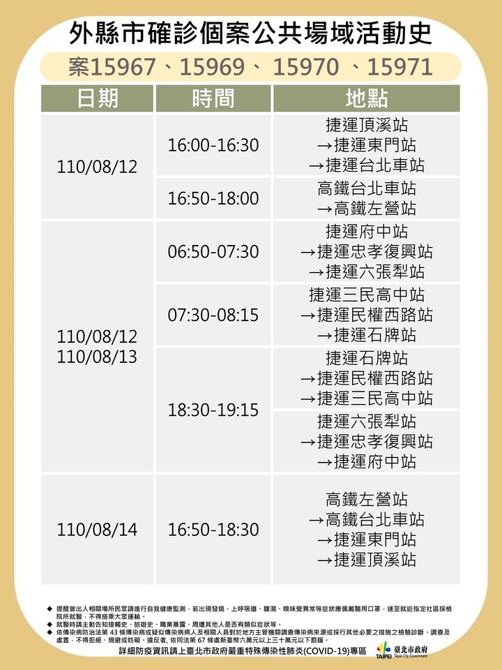台北市衛生局17日公布案15967、案15969、案15970及案15971足跡,皆屬於新北市個案,於8月15日確診,曾經搭乘過的高鐵和捷運都完成清消;北市接獲新北市通知後,第一時間立即啟動疫調、接觸者匡列及通知職場與風險場域進行環境清消,已匡列接觸者並擴大採檢210人,其中已完成採檢107人,分別至各職場,進行疫調、風險評估、衛教及匡列接觸者。