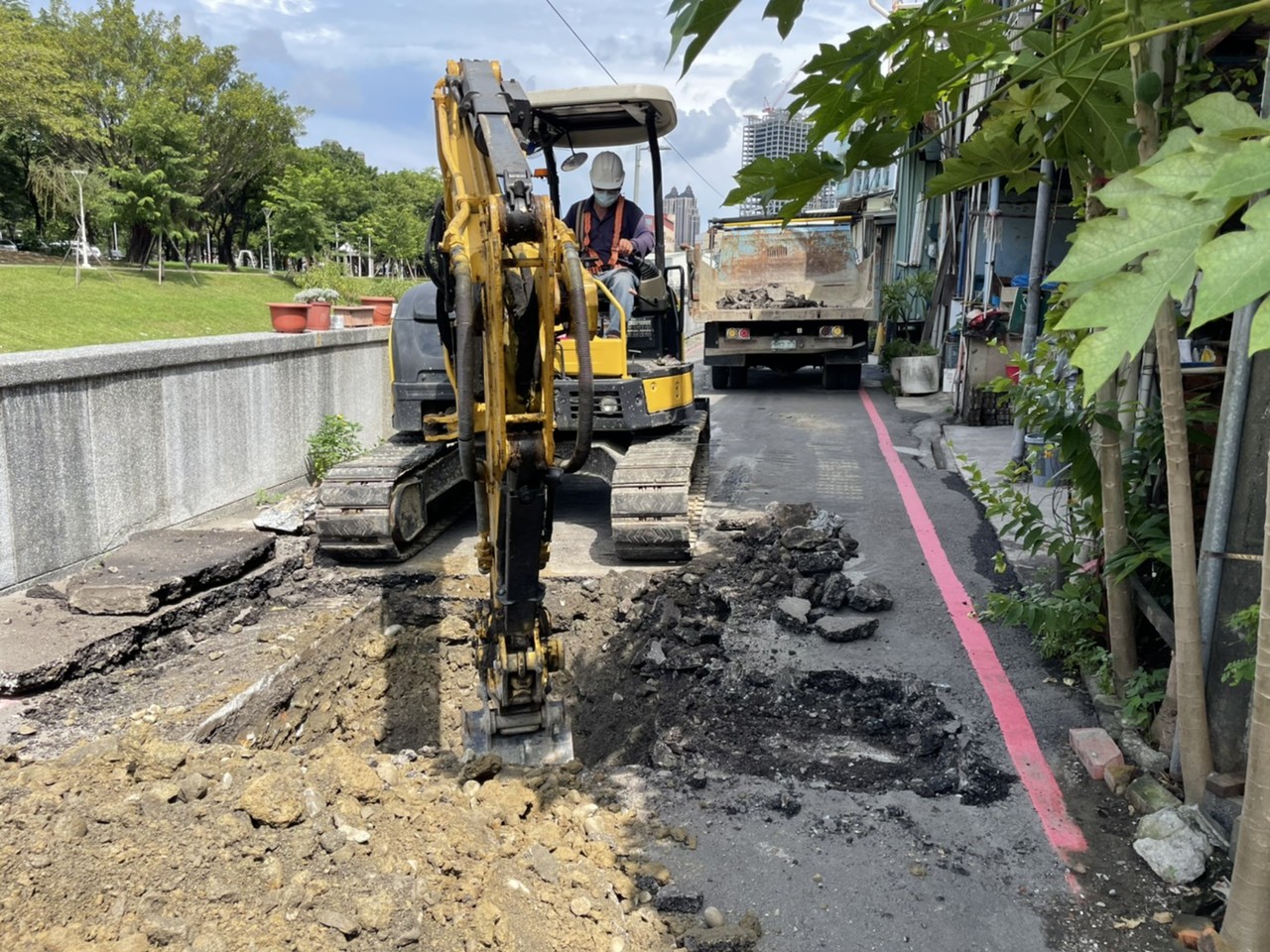 水利局表示,現況受損道路主要受到最近連續降雨影響,導致道路有下陷、開裂情形,但孝順街505巷旁護岸經目視檢視並無明顯開裂破壞狀況。為慎重起見,水利局今已調派機具現場進行開挖,初步看起來是緊鄰道路的住家家戶排水連通管破損,目前會把破損管線接起來再回填,預期可能需要1-2天,但會盡量趕工。