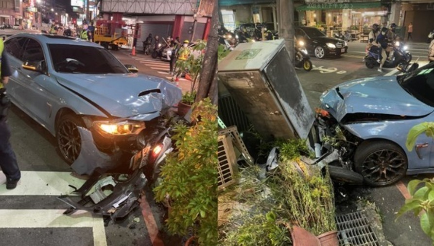 台中市西區向上路一段、華美街口17日晚間發生交通事故,25歲藍姓男子駕駛要價超過200萬的BMW 4系列轎車行經該路口時,疑因撿東西不專心,撞上對向一輛轎車,隨後再波及2輛機車、另一輛轎車,形成連環車禍,共計造成4人受傷、6輛汽機車受損,幸無人有生命危險;另外,路旁的號誌箱、娃娃機台、冷氣壓縮機也遭牽連,包含賠償費用與自身車輛維修費,藍男恐須花費破百萬元。